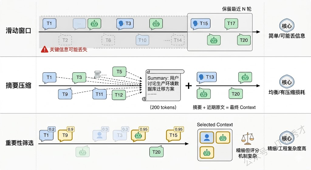 第三种是基于重要性的选择性保留,给每条消息打一个重要性分数(比如包含用户明确指令的消息分数高,闲聊的分数低),然后优先保留高分消息。这种方式更精细,但重要性评分本身又是一个不小的工程问题。