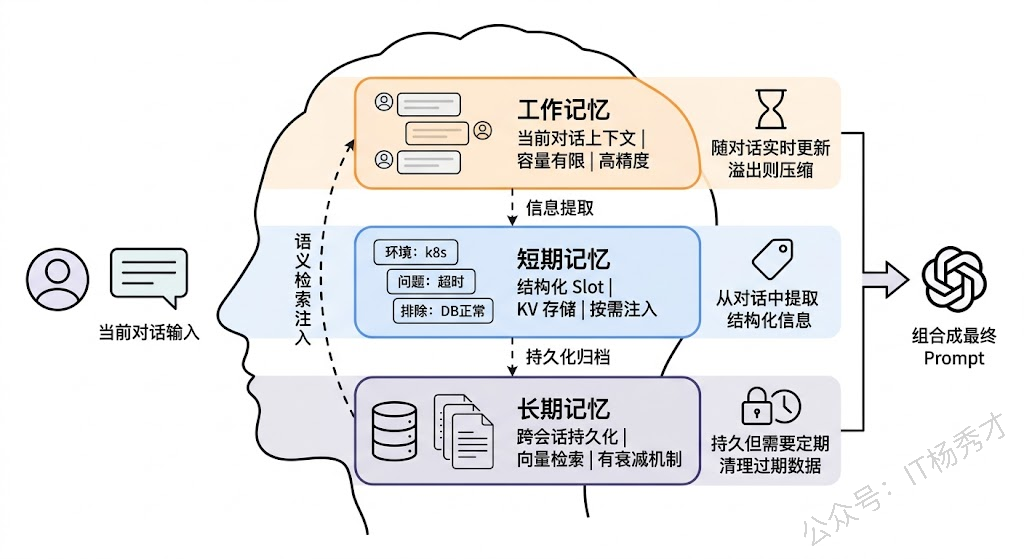- 短期记忆(Short-term Memory),用来存储当前会话或近几次会话中提取出的结构化信息。比如在一次帮用户排查 bug 的对话中,Agent 从对话里提取出"问题现象:接口超时"、"环境:生产环境 k8s"、"已排除原因:数据库连接正常"这些结构化 slot,存进一个轻量的 key-value 存储里。这些信息不依赖原始对话文本,所以不占上下文窗口,但又随时可以按需检索注入到 prompt 中。