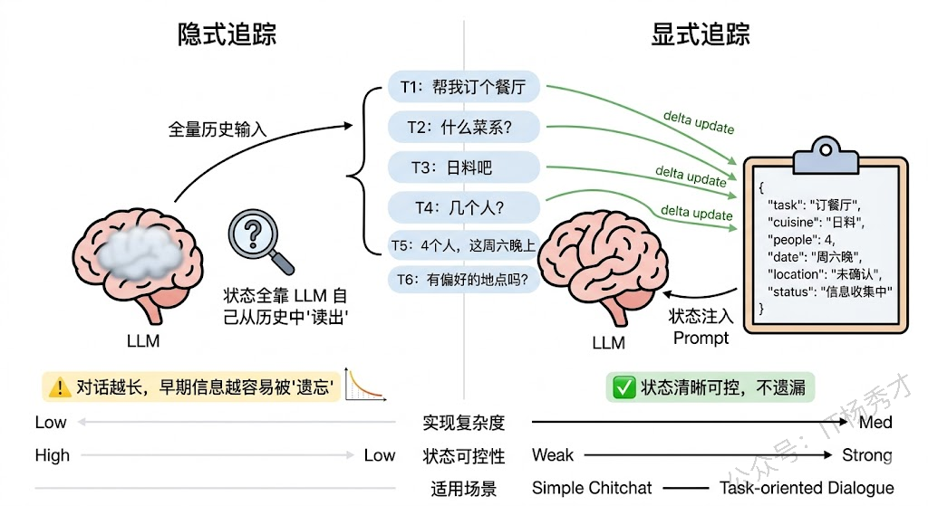 第一种是隐式状态追踪:不显式维护任何状态对象,完全依赖 LLM 从对话历史中"读出"当前状态。每轮对话时把完整历史送进去,LLM 自己判断现在该做什么。这种方式实现最简单,但问题是当对话变长后,LLM 对远处上下文的注意力会衰减(lost in the middle 问题),可能遗漏早期的关键信息。
