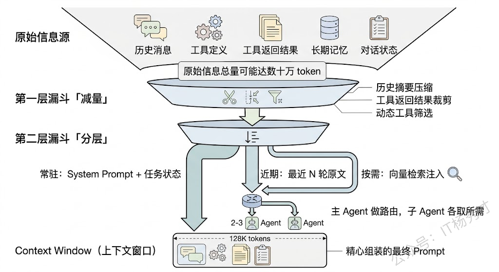 第一层:减少输入量。除了前面提到的对话历史压缩和摘要之外,还有一些细节值得关注。比如工具调用的返回结果往往很长(一个 API 返回了一大坨 JSON),但真正有用的可能只是其中几个字段——可以在工具返回结果后做一次裁剪,只保留和当前任务相关的字段。再比如 system prompt 里的工具定义,如果 Agent 有 20 个工具,每个工具的描述占 200 token,光工具定义就占了 4000 token。可以根据当前对话的主题做动态工具筛选,只把可能用到的工具定义送进去。