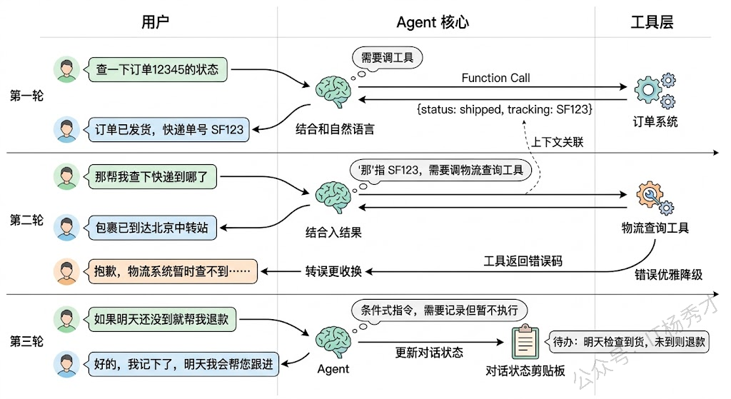 其次是多轮工具调用的状态连续性。用户可能在第一轮说"查一下订单 12345 的状态",Agent 调了订单查询工具返回结果,第二轮用户接着说"那把它取消掉"——这里 Agent 需要理解"它"指的是订单 12345,并且需要把上一轮的查询结果作为上下文来构造取消请求的参数。工具调用的上下文不能丢。