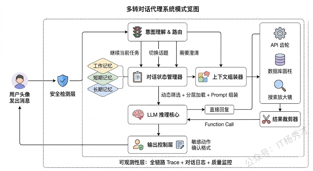安全防护与输出控制。多轮对话天然比单轮更容易被 prompt injection 攻击——攻击者可以在前几轮对话中逐步"铺垫",最后在某一轮触发恶意行为。所以每一轮的输入都需要过安全检测,不能因为"前几轮是正常的"就放松警惕。此外,对话中涉及的敏感操作(删除数据、发送消息、支付等)需要有二次确认机制和操作审计日志。