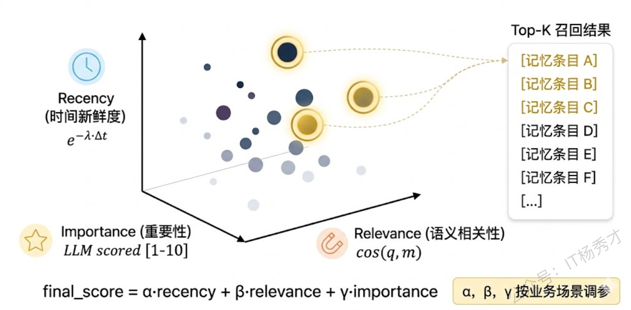 最朴素的做法是纯向量相似度检索——把当前 query embedding 之后去向量库里找最近邻。但在实际场景中,光靠语义相似度远远不够。斯坦福那篇经典的 Generative Agents 论文给出了一个非常优雅的三维评分模型,在实际项目中也可以沿用这个思路: