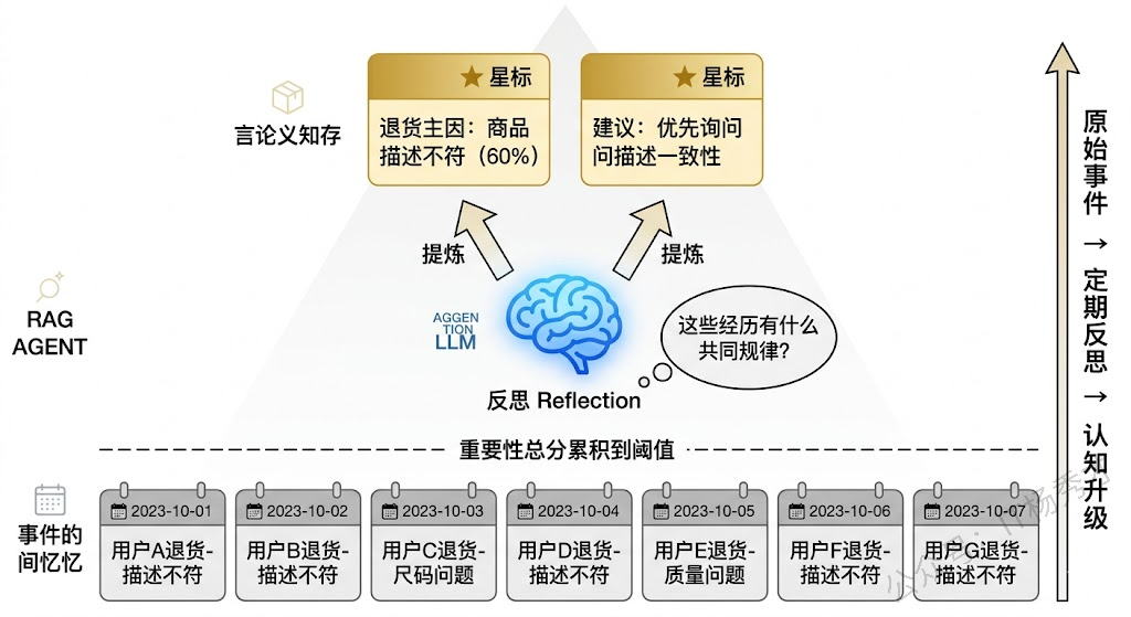纯粹的事件记录(情景记忆)会让记忆库越来越庞大,但 Agent 的认知水平却没有真正提升。就像一个人经历了一百次客户投诉但从来不总结规律,他处理第一百零一次投诉时不会比第一次强多少。
