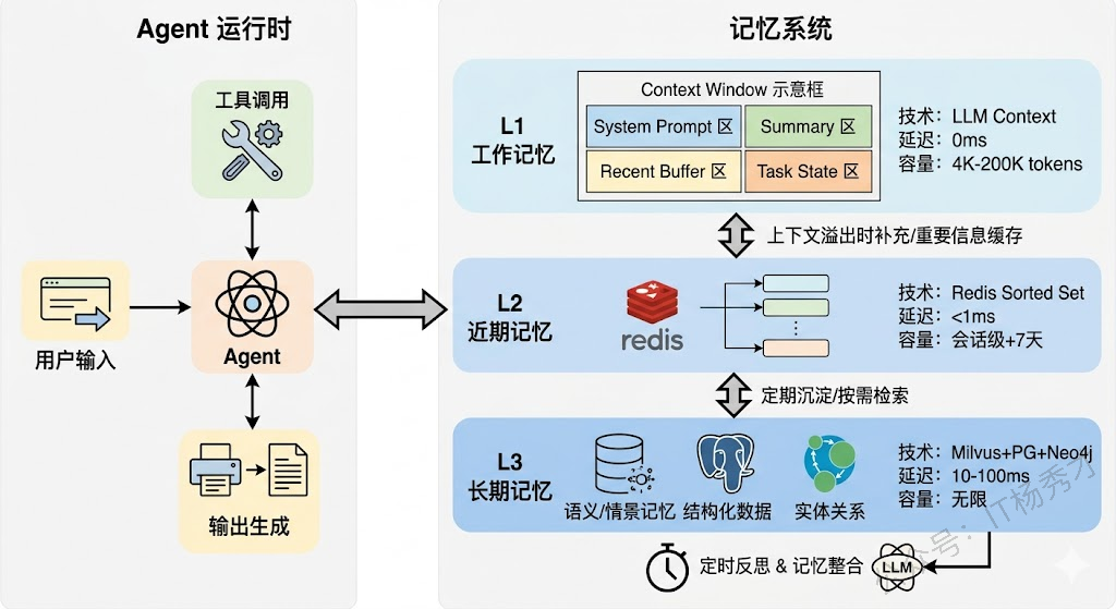 把上面的设计思路落到工程上,我通常采用一个三层架构来组织记忆系统: