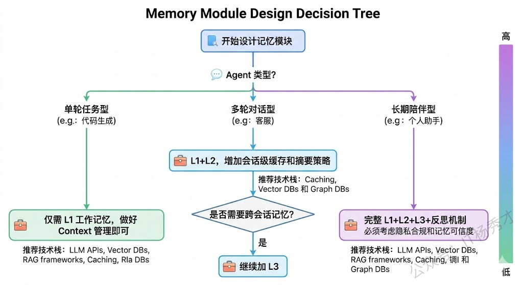 这道题的有意思之处在于,它问的是"你一般会怎么设计",而不是"记忆模块有哪些类型"。面试官想听的是你的设计思路和工程决策过程——面对一个具体的 Agent 项目,你脑子里的设计框架是什么,你会从哪几个维度去思考,不同场景下你会做怎样的取舍。