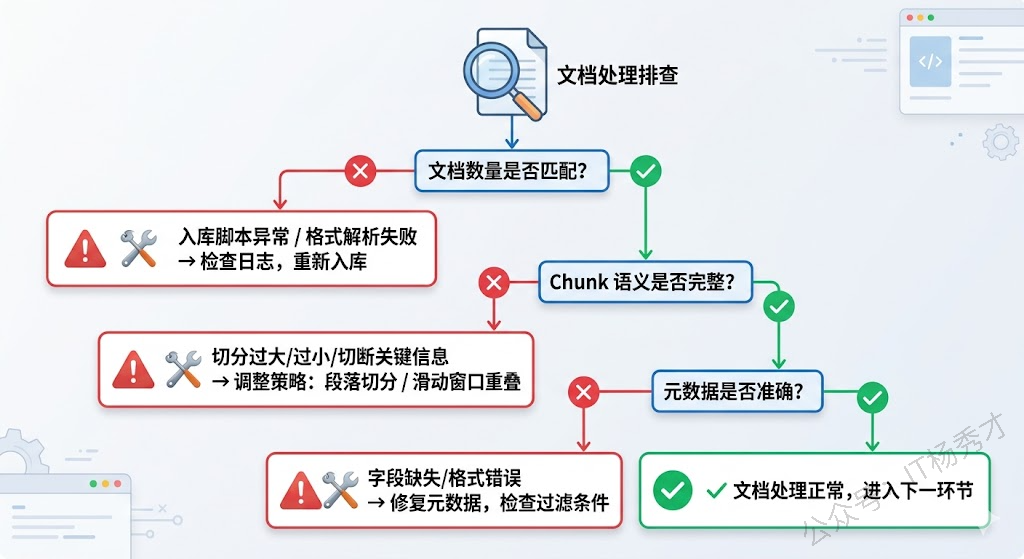很多时候根因出奇地简单——文档压根没有正确入库。入库脚本跑挂了、某些 PDF 解析失败静默跳过了、或者入库过程中途异常退出只进了一半,这些情况在生产环境中比想象的常见得多。