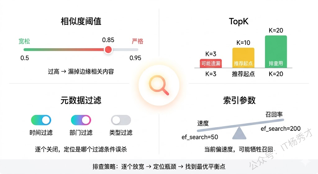向量化没问题,但结果还是不理想,问题往往出在检索参数配置上。这一层的排查思路是逐个放宽限制,看哪个参数卡住了召回。