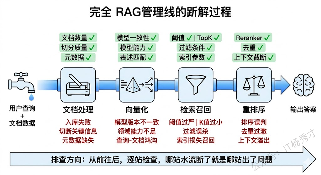 做过 RAG 系统的人都知道,上线之后最头疼的不是模型幻觉,而是检索不到想要的东西。"我明明上传了这个文档,为什么问不出来"。检索不到,意味着后面的生成环节再强也是徒劳。而这个问题之所以难排查,是因为 RAG 的检索链路是一条多环节串联的管道——文档处理、向量化、检索召回、结果过滤,任何一个环节出了问题,最终表现都是一样的:用户问了,系统答不上来。