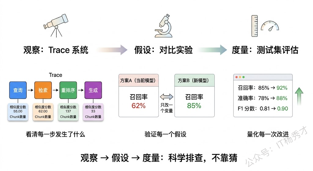 同时最好还要有对比实验。怀疑 Embedding 模型不行?换一个跑同样的查询对比。怀疑切分策略有问题?用不同策略重新入库对比效果。每次只改一个变量,就能精确定位问题。