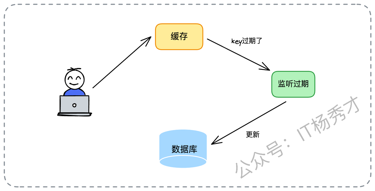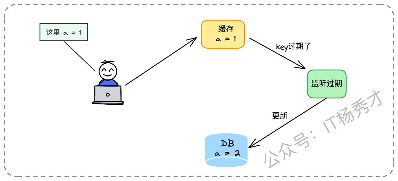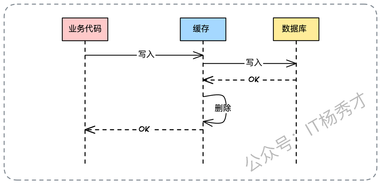 这种做法也可以结合 Write Through 模式来做:让缓存组件去更新数据库,然后缓存组件自己把自己删了。