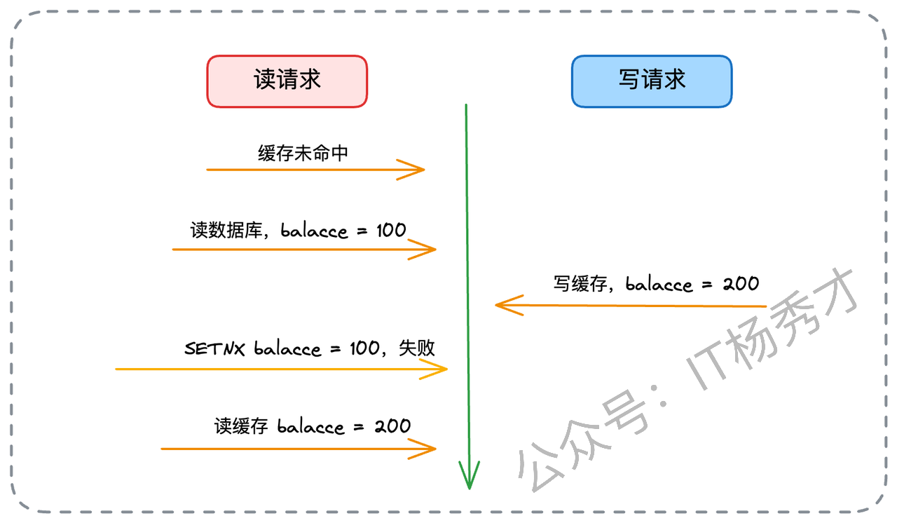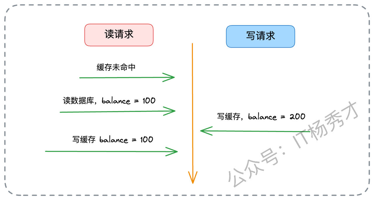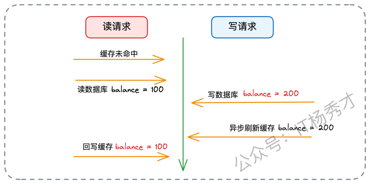 balance=100)。还没来得及回填缓存,突然来了一个写请求,把缓存设为了新值(