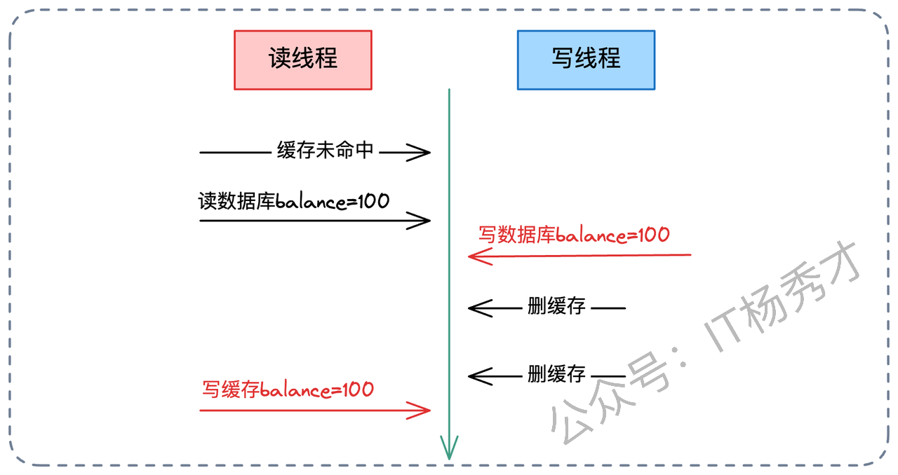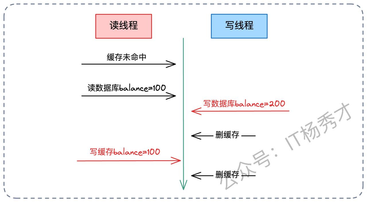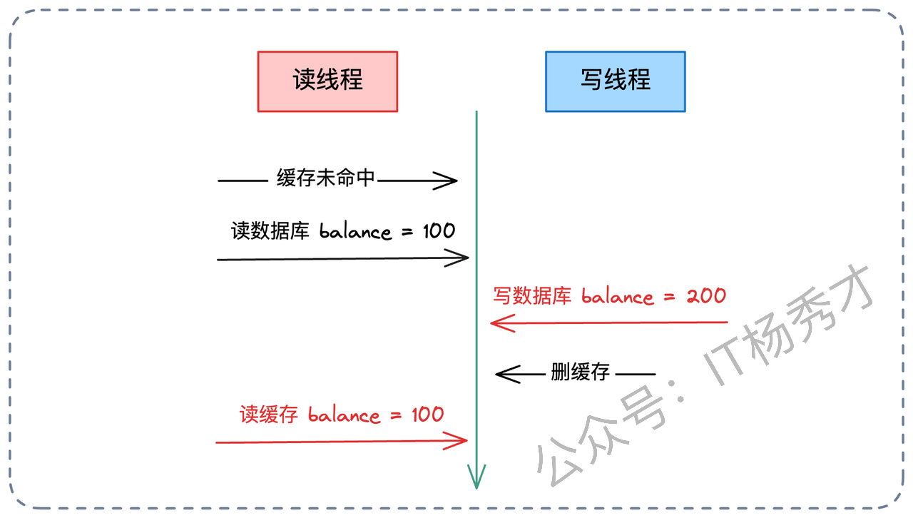 balance=100)。在读线程回填缓存之前,写线程 进来了,改了库(