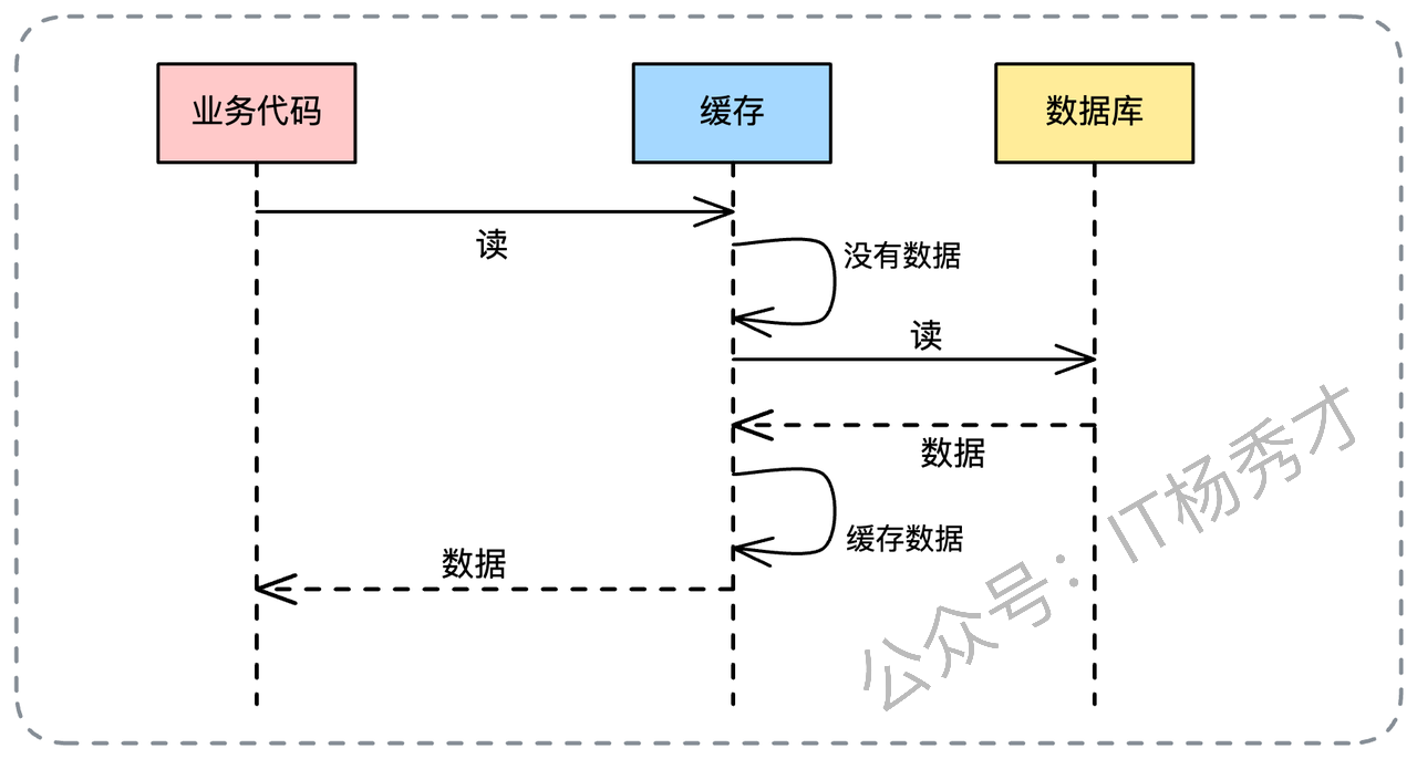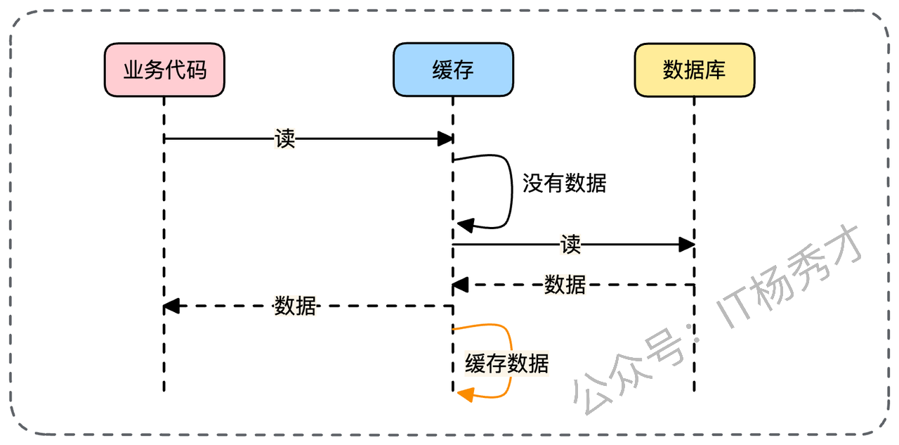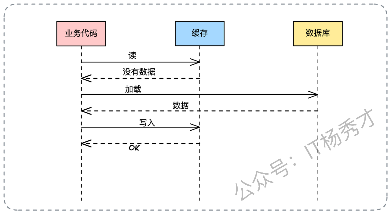 缓存回填:如果缓存中没有数据(Miss),应用程序需要转向数据库发起查询。成功拿到数据后,由应用程序显式地将数据写入缓存,最后将结果返回给调用方。