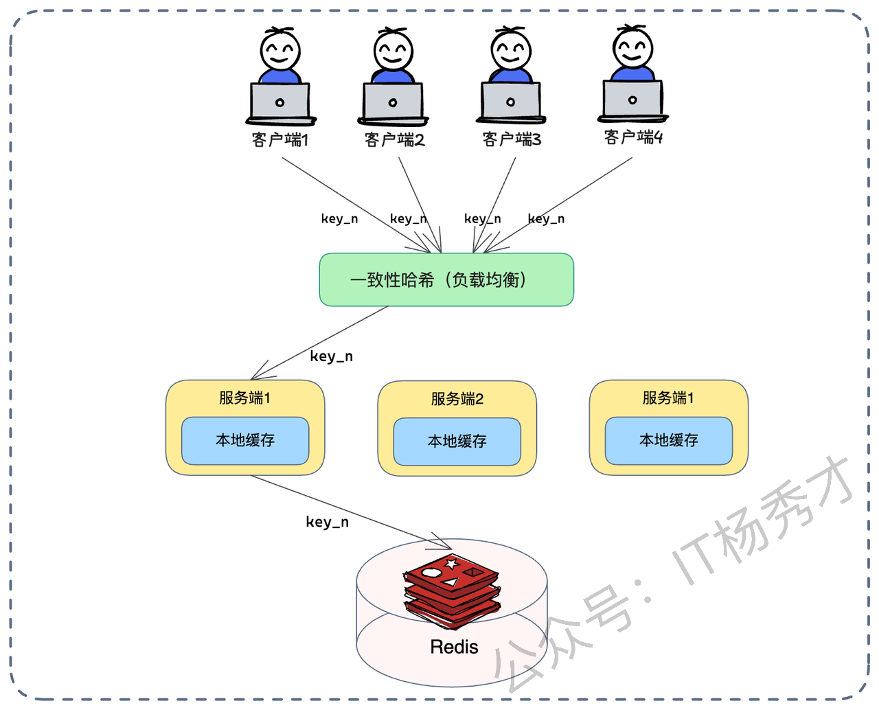 我们先来看一个经典的组合拳方案:一致性哈希 + 本地缓存 + Redis 缓存。大家对“本地缓存 + Redis”的二级缓存模式想必并不陌生。但是,这种常规组合在面对极致性能要求时,往往显得有些力不从心。接下来秀才就分享一个我遇到过的真实案例。