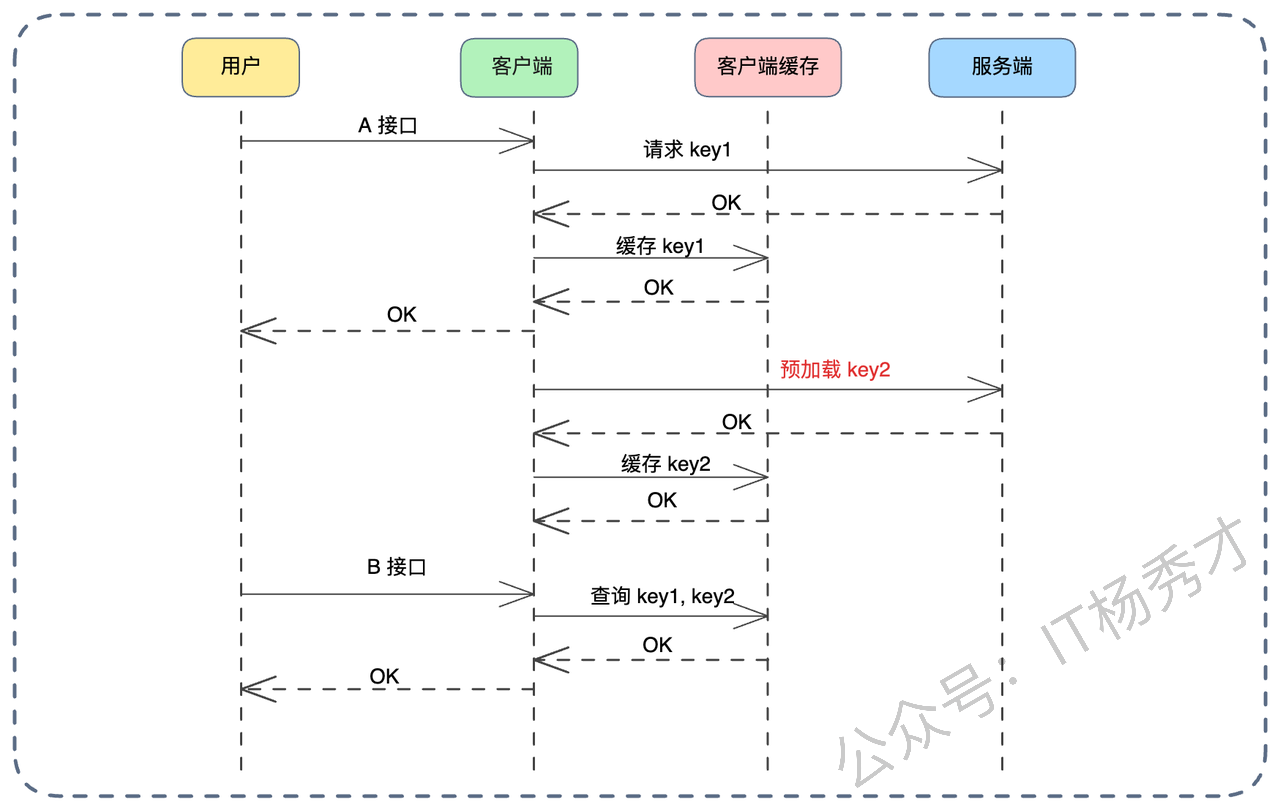 我们在处理“提交订单”接口时,除了完成订单创建逻辑,还可以异步地发起微服务调用,将该订单的支付详情、优惠券信息、支付渠道配置(图中的 Key2)等数据提前查询并放入缓存。 当用户真的跳转到“支付页面”调用接口 B 时,数据已经在缓存里等着了,用户会感觉页面跳转极其顺滑,系统响应极快。
