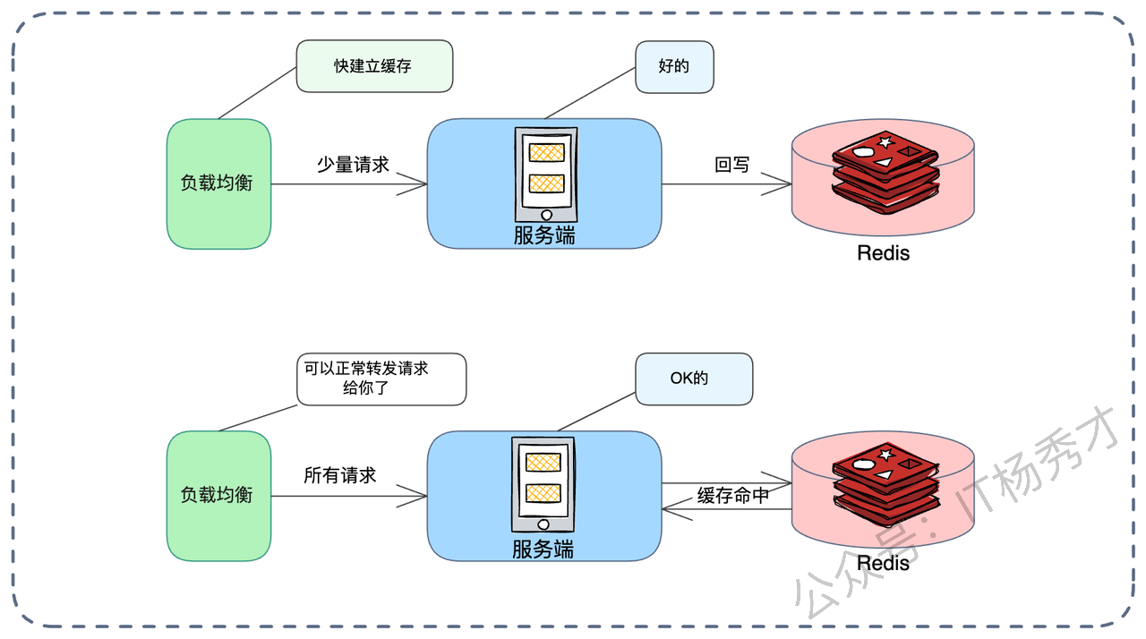 冷启动阶段(图示上方流程):新节点刚启动时,将其权重调低(比如少量请求),只让它分配到少量流量。