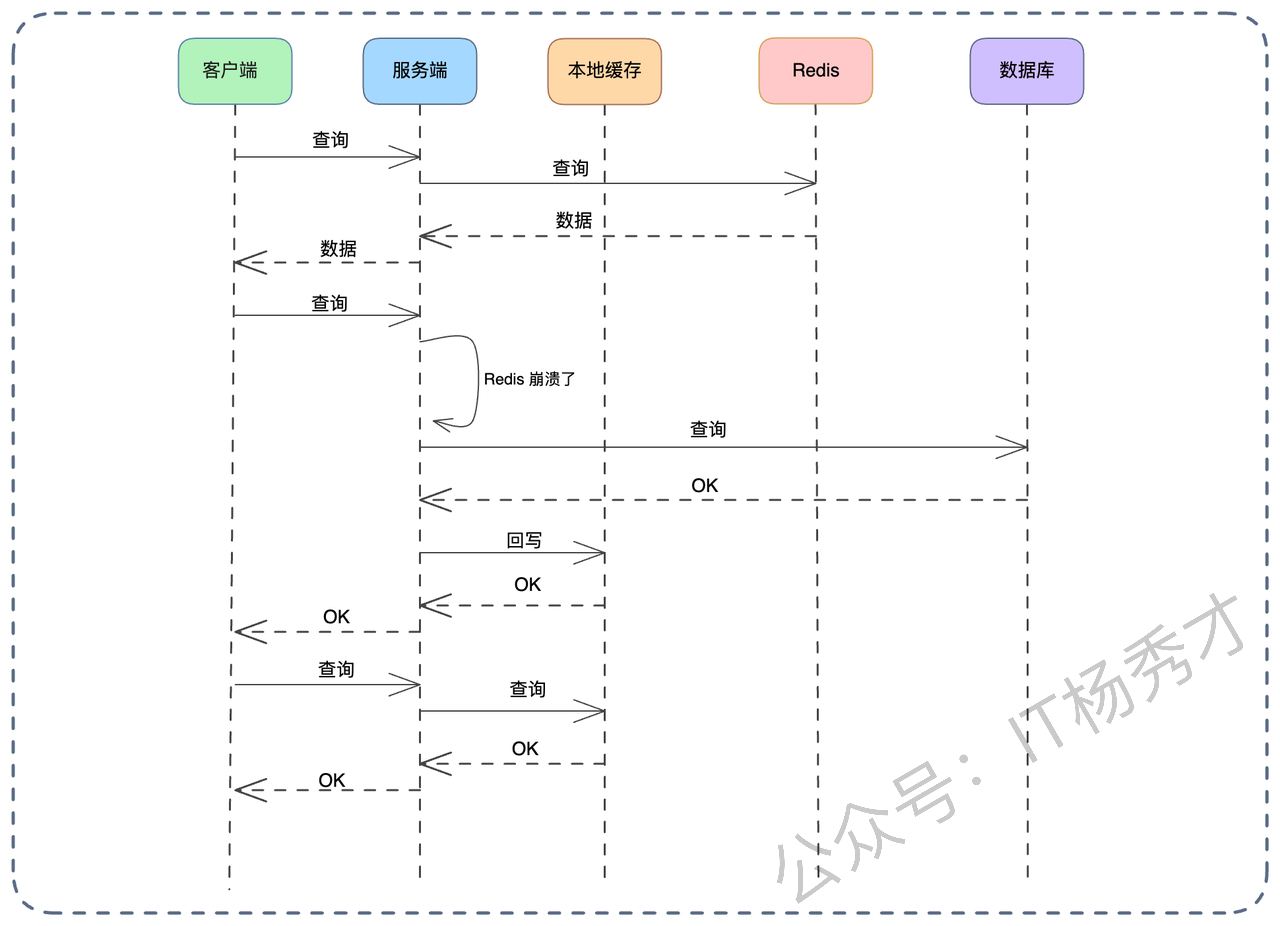 这个方案听起来似乎“反其道而行之”,因为通常我们是先查本地再查 Redis。但在这个场景下,本地缓存的作用是保护数据库。想象一下,当 Redis 突然不可用,成千上万的 QPS 瞬间击穿到数据库,数据库必死无疑。而启用本地缓存,虽然可能会面临数据时效性的问题(数据可能是旧的),但它能挡住绝大部分流量,保住数据库,让系统“活下来”。