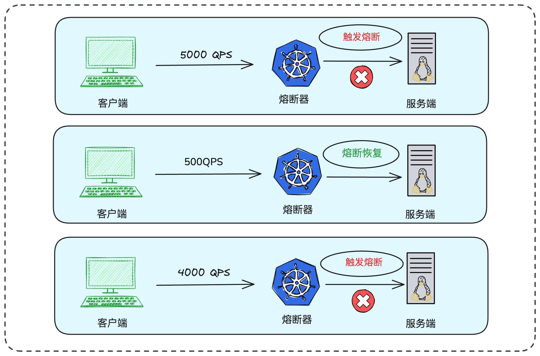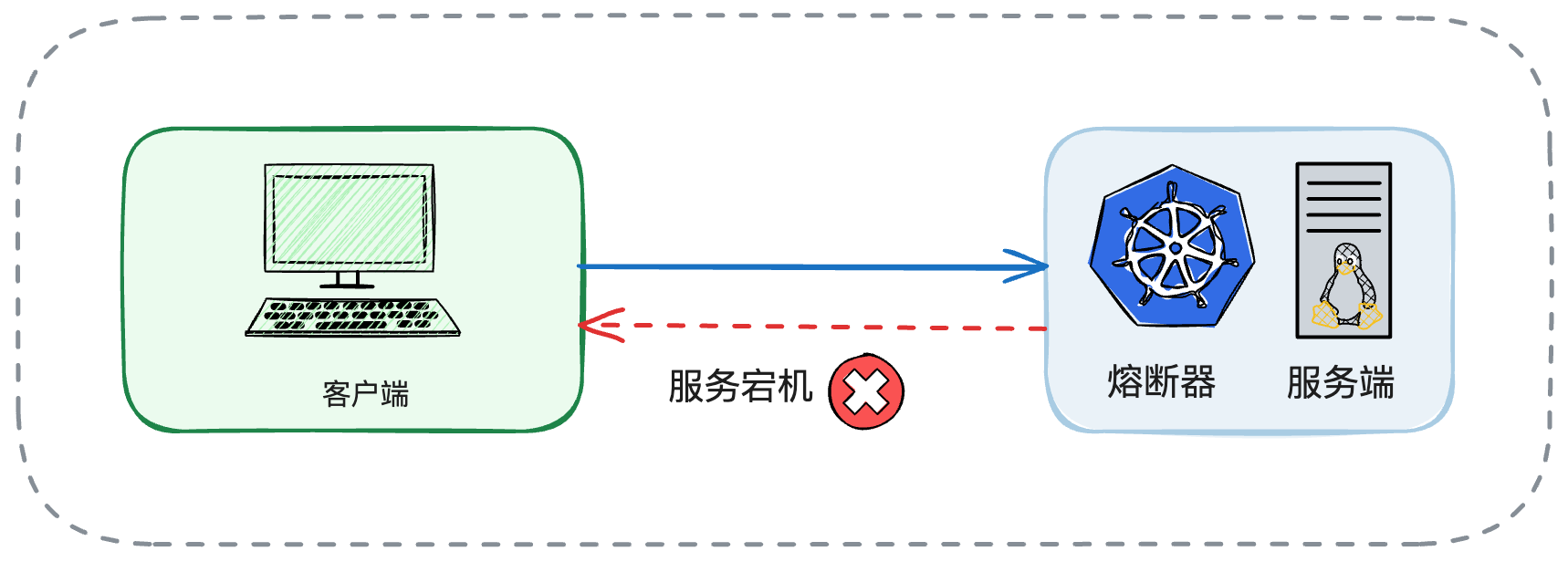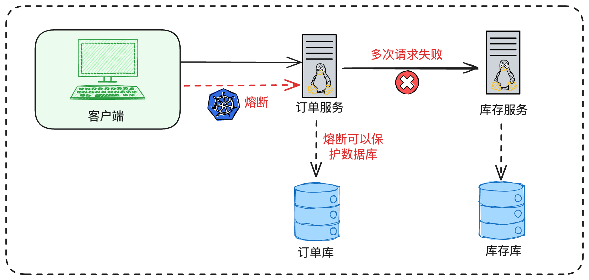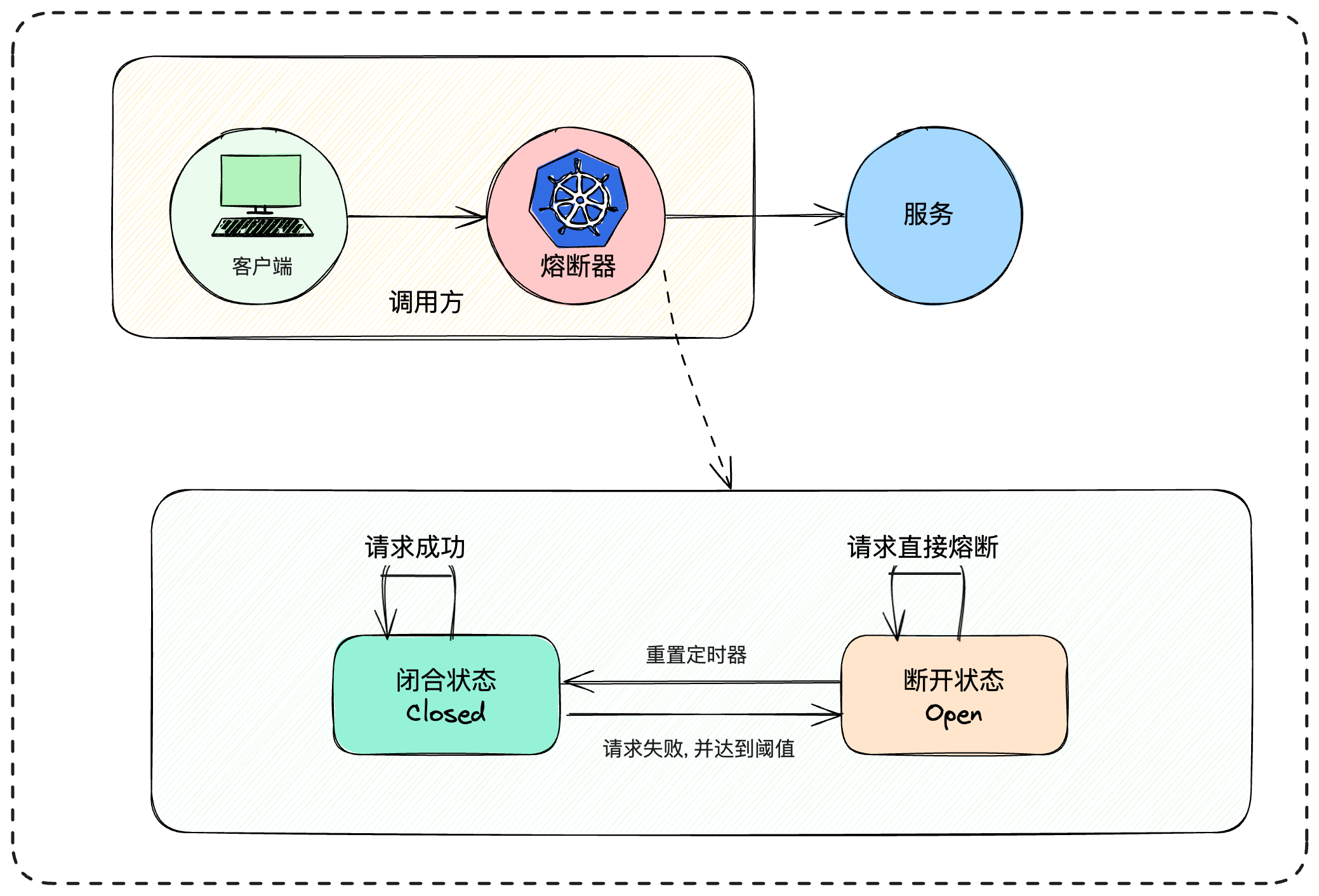 在软件架构中,熔断机制的设计实现也类似。它在服务的调用方内部,设置了一个监控哨兵。当它监测到对某个下游服务的调用,在一段时间内失败率持续过高时,就会主动“断开”连接,后续的请求将不再真正发出,而是直接在调用方内部快速失败,立即返回错误。