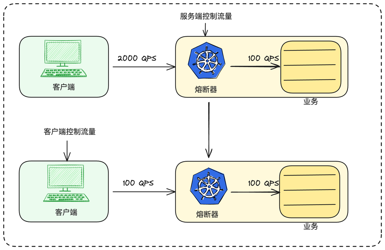 我们之前讨论过,即使是在服务端逐步放开流量,服务端依然接收了全部请求,只是在内部进行了丢弃。这本身就是一种资源浪费。那么,为什么不从源头——也就是客户端——来控制流量呢?