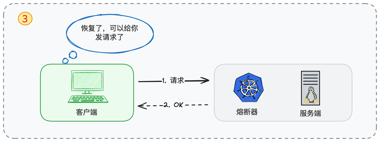 第二个核心问题是,服务在进入熔断状态后,如何优雅地恢复。一个服务因为响应过长而熔断了,它拒绝了所有新流量。在几分钟后,积压的任务处理完毕,服务本身可能已经恢复了正常状态。此时,它需要退出熔断状态,重新开始服务。