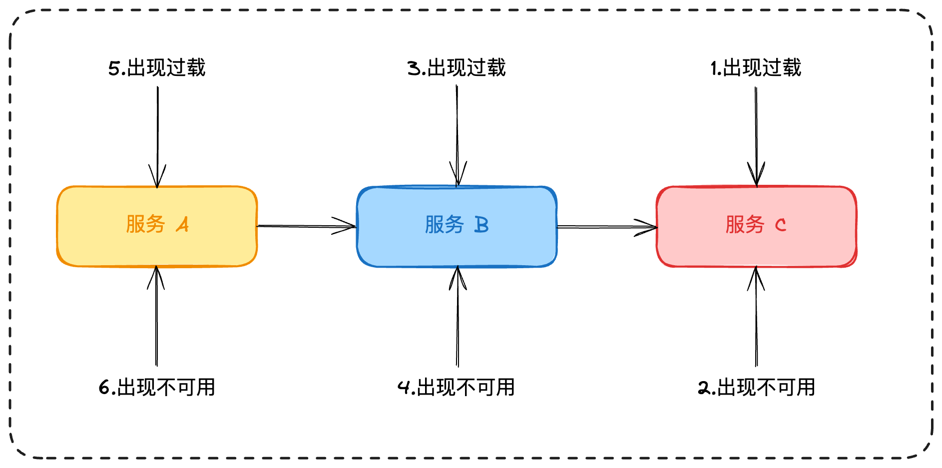 这个过程会像多米诺骨牌一样,沿着调用链路一路逆向传播(服务B -> 服务A),最终导致整个调用链上的所有服务全部瘫痪,系统发生“雪崩”。