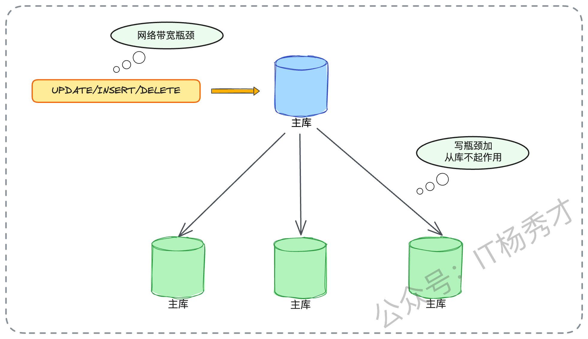 读写分离失效:所有的INSERT、UPDATE、DELETE操作,都必须打在主库上。如果你的业务场景(例如高并发的订单、支付、日志写入)是主库的写入TPS或网络带宽达到了物理天花板,那么无论你挂载多少个从库,主库的压力都无法缓解。
