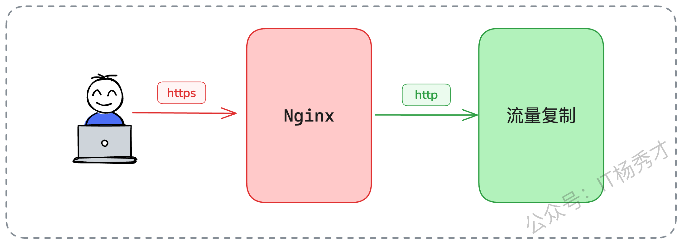 我们可以在 Nginx 之后接入流量复制组件。用户和 Nginx 之间是HTTPS通信,但是 Nginx 和后面的服务器(包括流量复制组件)之间是HTTP通信,这样就可以避开HTTPS的问题。
