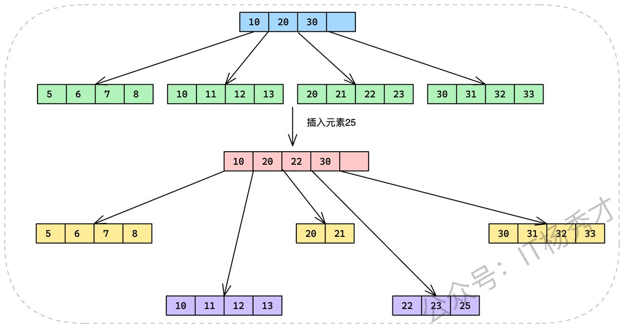 数据库的B+树索引结构中,数据按照主键大小有序存储在叶子节点上。当我们需要插入一条新记录时,如果这条记录的主键值恰好位于某个已满的叶子节点中间,就会触发页分裂操作。比如图中所示,当尝试在23之后插入25时,由于叶子节点已经放满,数据库不得不将这个节点分裂成两个节点,分别存储(20,21)和(22,23,25)。更严重的是,这种分裂可能会引发连锁反应,从叶子节点一直向上分裂到根节点,导致整个树结构都需要调整。