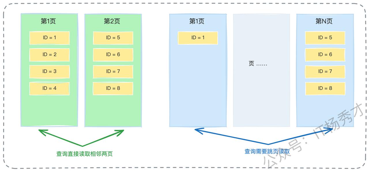 自增主键还有一个重要优势,就是数据会有更大的概率按照主键大小有序存储,两条主键相近的记录在磁盘上的物理位置也是相近的。在进行范围查询时,我们能够更加充分地利用磁盘的顺序读特性,大幅提升查询性能。相比之下,使用UUID作为主键时,由于ID是随机的,相近逻辑的数据在物理存储上可能相距很远,无法利用顺序读的优势。
