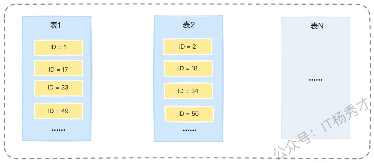 我们可以通过一个具体例子来说明这种方案。假设经过分库分表后,我们有16张表,那么可以让每张表按照不同的步长来生成自增ID。比如第一张表生成1、17、33、49这样的ID序列,第二张表生成2、18、34、50这样的ID序列,以此类推,每张表的起始值不同,但步长都是16。