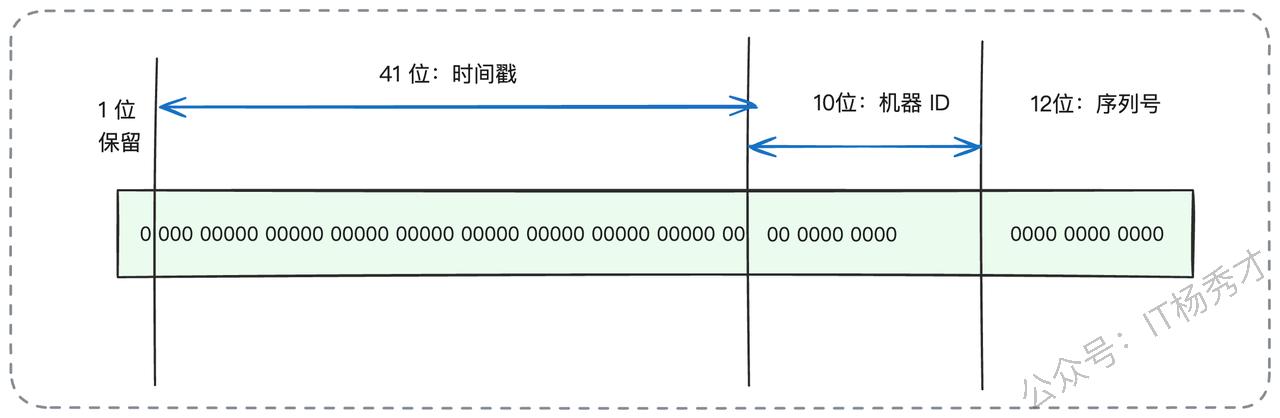 雪花算法采用64位来表示一个ID,其中1位保留未使用,41位表示时间戳,10位作为机器ID,12位作为序列号。这种设计保证了ID的唯一性:时间戳是递增的,不同时刻产生的ID肯定不同;机器ID是不同的,同一时刻不同机器产生的ID肯定不同;同一时刻同一机器上,可以通过序列号来区分不同的ID。
