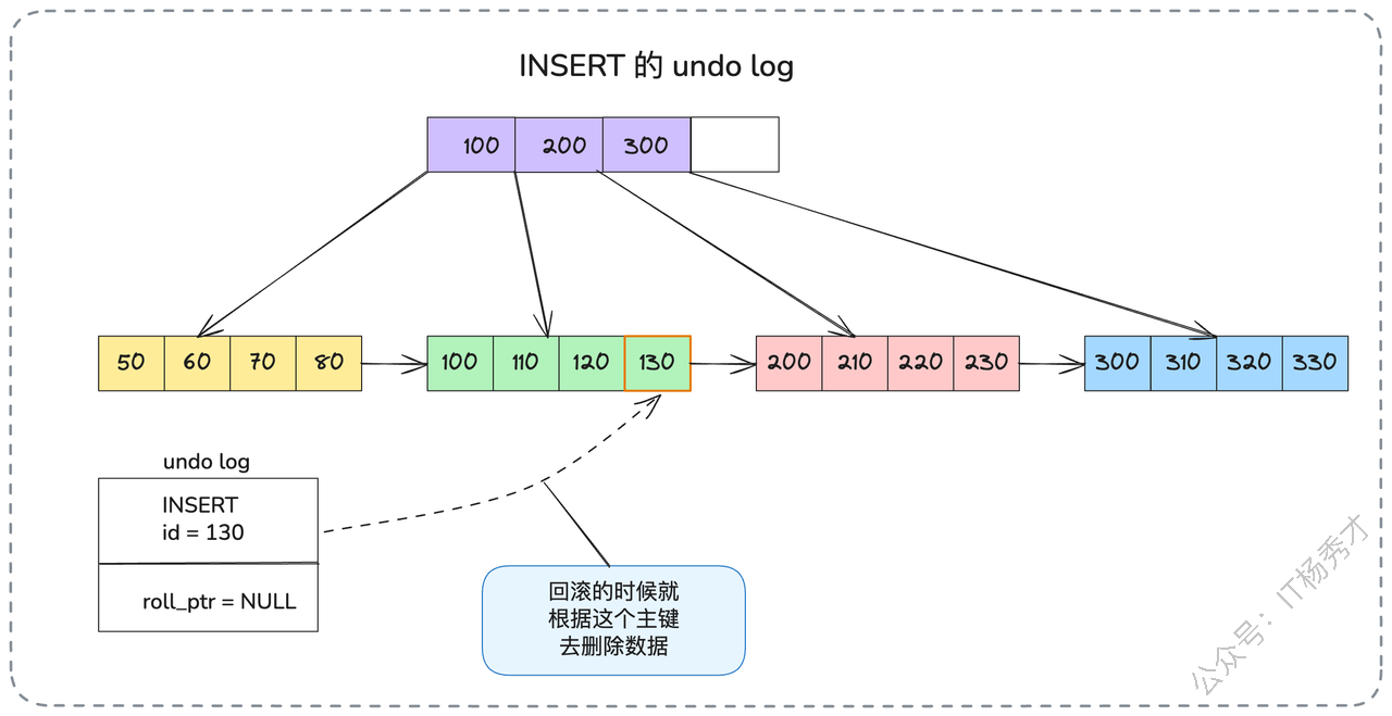 INSERT语句,其对应的undo log在逻辑上是一条DELETE语句。回滚时,只需根据日志中记录的主键信息将新插入的数据删除即可。对于一条