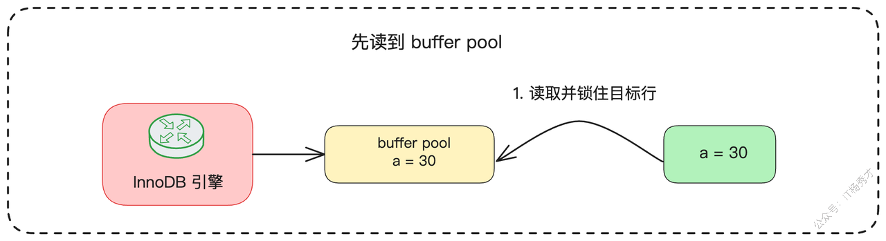 - 定位与加锁:事务启动,InnoDB通过索引定位到id=1的目标记录,将其从磁盘加载到buffer pool中,并对该行记录施加排他锁(X锁)。