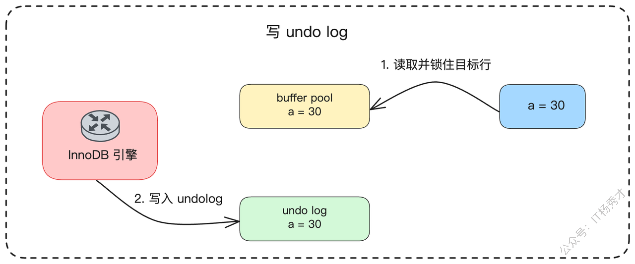 buffer pool中的数据进行任何修改之前,InnoDB会先为这次操作生成一条undo log,其中记录了a列的原始值30。这是为了后续可能的回滚做准备。