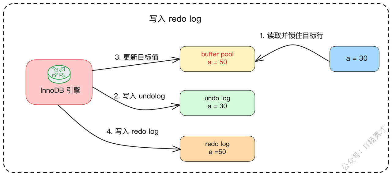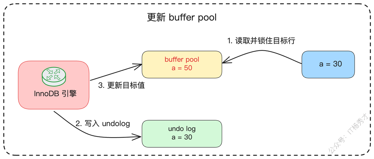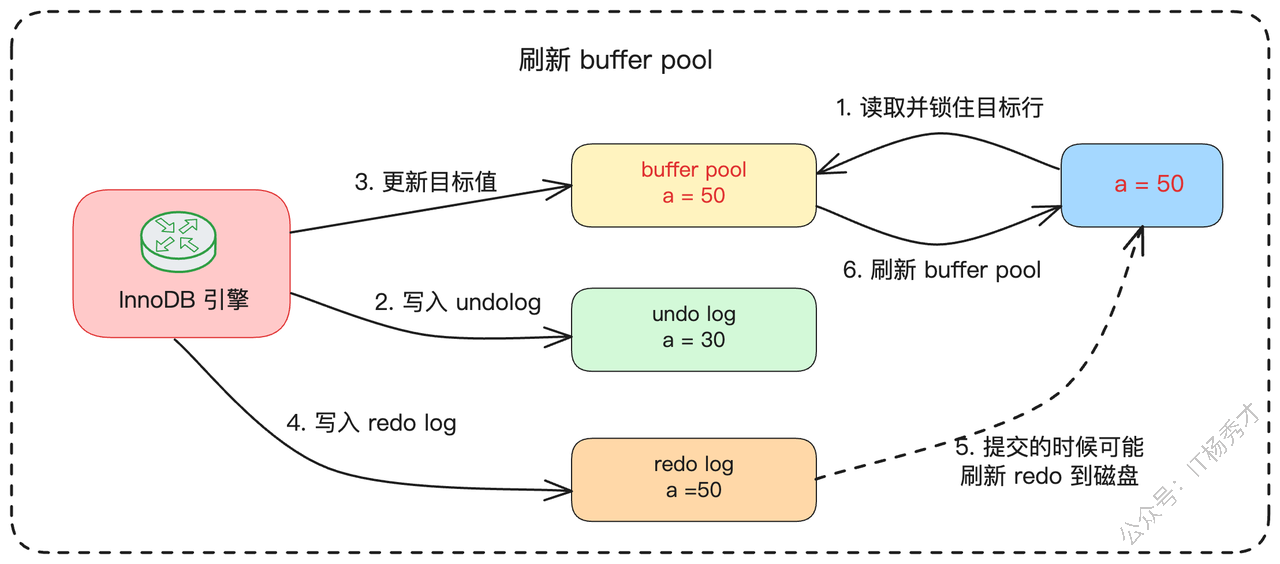 - 更新Buffer Pool:接着,InnoDB在内存中执行更新操作,将buffer pool里该行数据a列的值由30修改为50。至此,内存中的数据已经更新,但磁盘上的数据文件尚未改变。