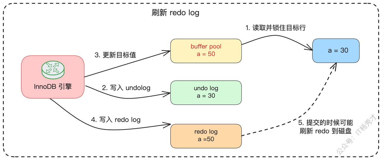 - 后台刷写脏页:事务虽然已经提交,但buffer pool中被修改过的数据页(现在是脏页)并不会立即刷盘。它会等待InnoDB的后台线程(如Master Thread)在后续某个合适的时机,将其异步地、批量地刷写到磁盘上的数据文件中。