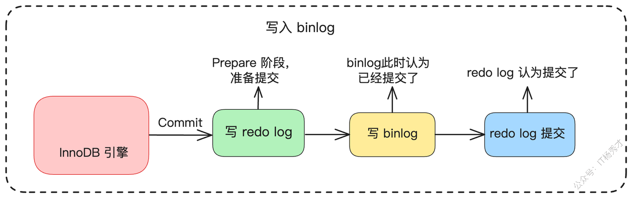 redo log刷盘,并将其状态标记为“准备”状态。阶段二:Binlog写入与Redo Log Commit(提交):接着,MySQL Server层写入