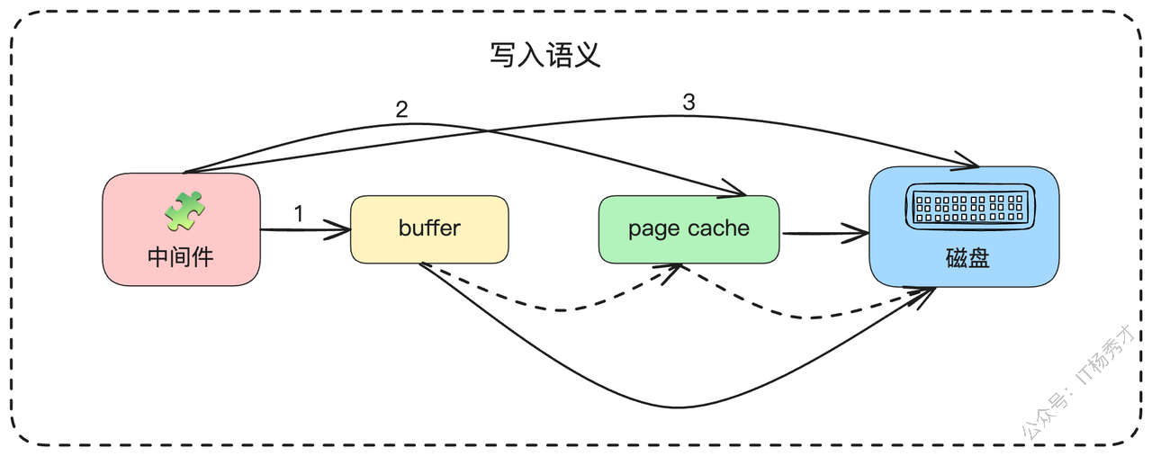 page cache后,认为写入成功。磁盘层确认:中间件强制发起刷盘(