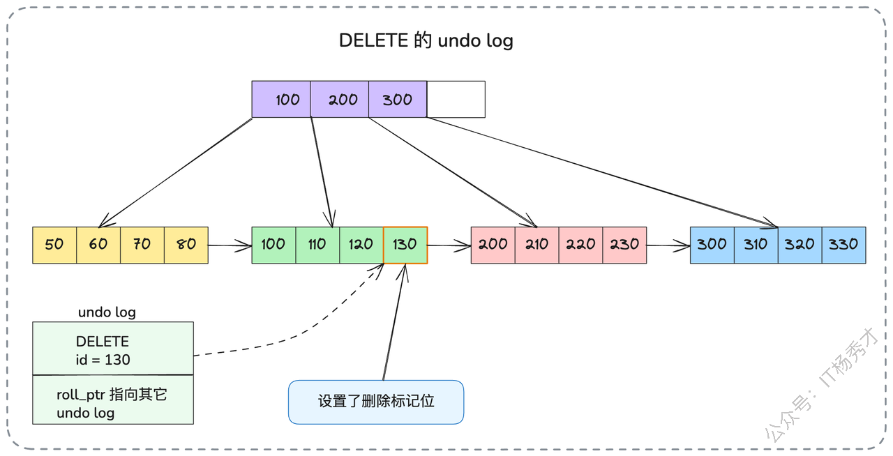 对于DELETE操作,undo log会记录被删除行的主键信息。这里需要特别指出,InnoDB在执行DELETE时,并不会立即将数据从磁盘上物理删除,而是通过修改记录头中的一个特殊标记位(delete flag)来标识该记录为“已删除”。因此,当事务回滚时,引擎可以根据undo log中的主键快速找到这条被标记的记录,然后将其删除标记位重新置为false,数据便得以恢复。