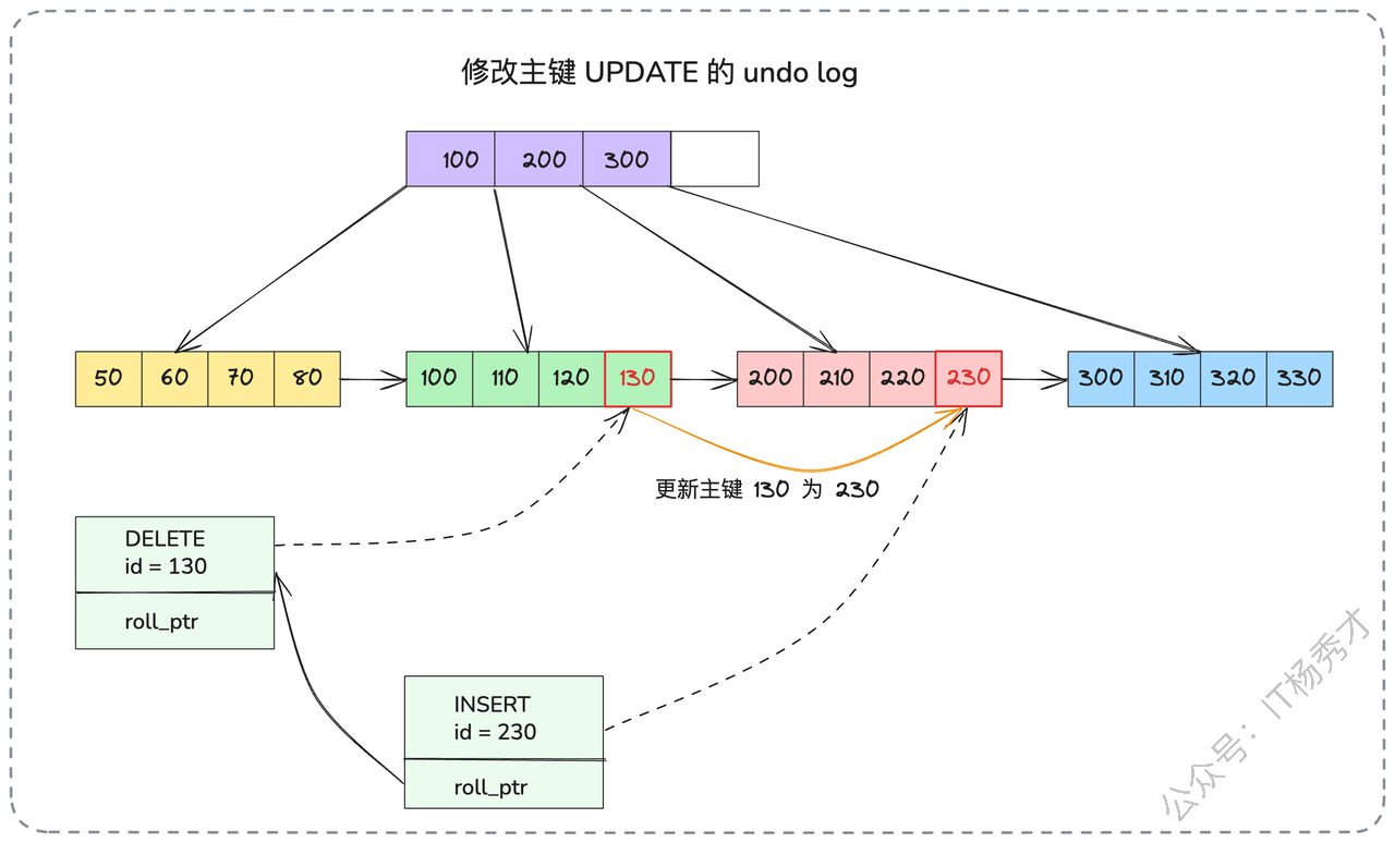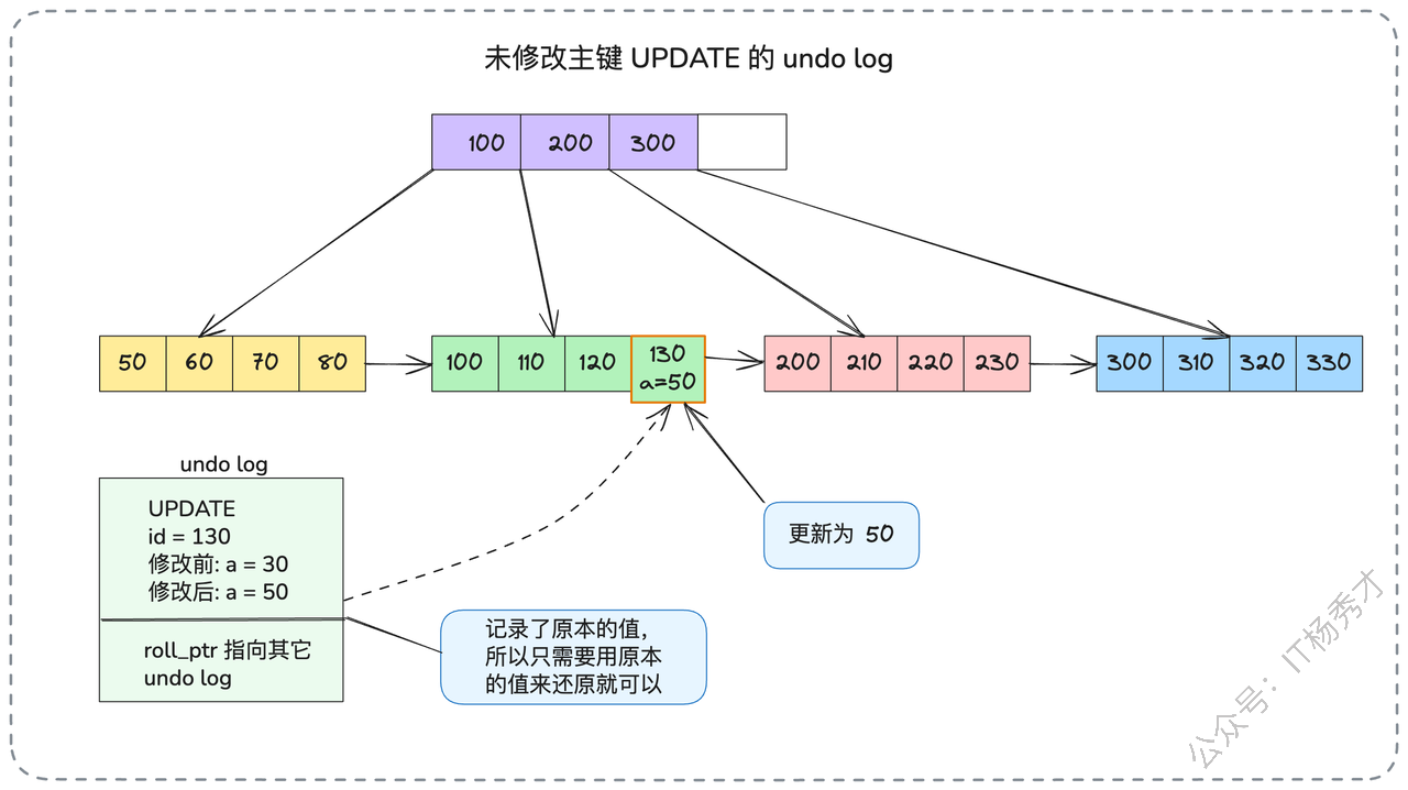 如果UPDATE语句没有修改主键列,那么undo log会记录下该行的主键以及所有被修改列的原始值。回滚时,只需根据主键找到该行,再用undo log中记录的旧值覆盖当前值即可。