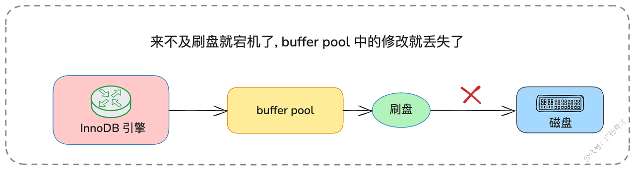 这个异步机制带来了数据丢失的风险:如果在buffer pool中的脏页尚未刷盘时,数据库就发生了崩溃,那么这部分已经完成的修改便会永久丢失。
