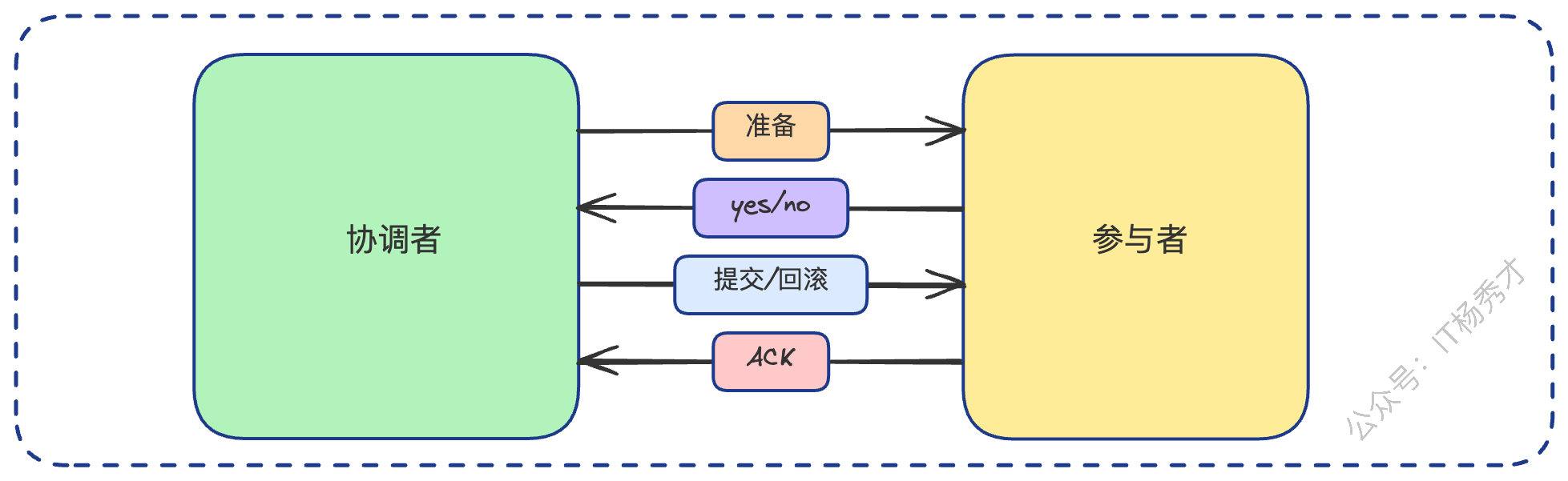 两阶段提交(Two-Phase Commit)是分布式事务中最广为人知的协议。其核心思路可以概括为:引入一个“协调者”(Coordinator),由它来统一指挥所有“参与者”(Participant)的行为,要么一起提交,要么一起回滚。
