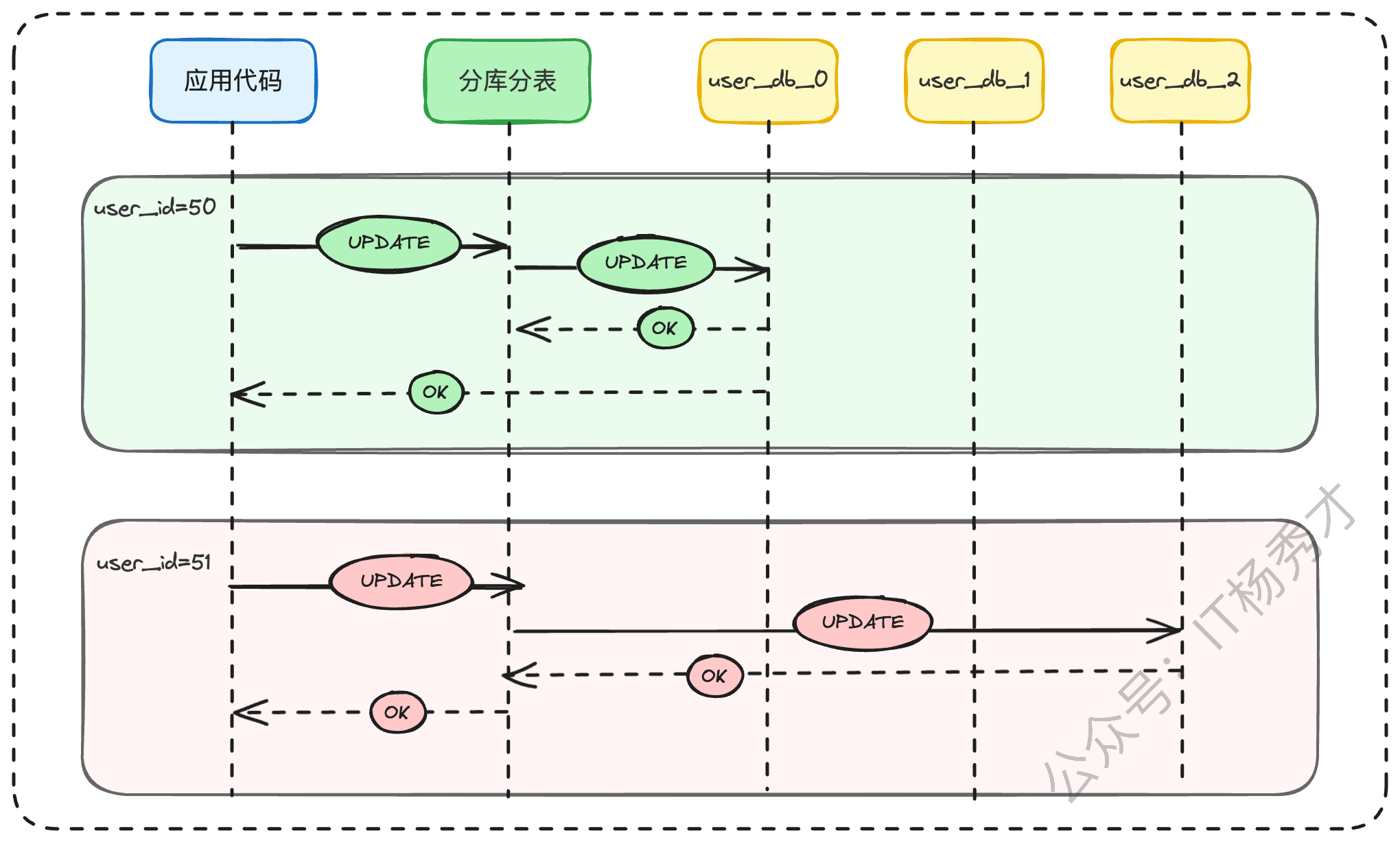 比如,一个 UPDATE 可能根据参数 user_id=50 路由到 db_0,也可能根据 user_id=51 路由到 db_2。