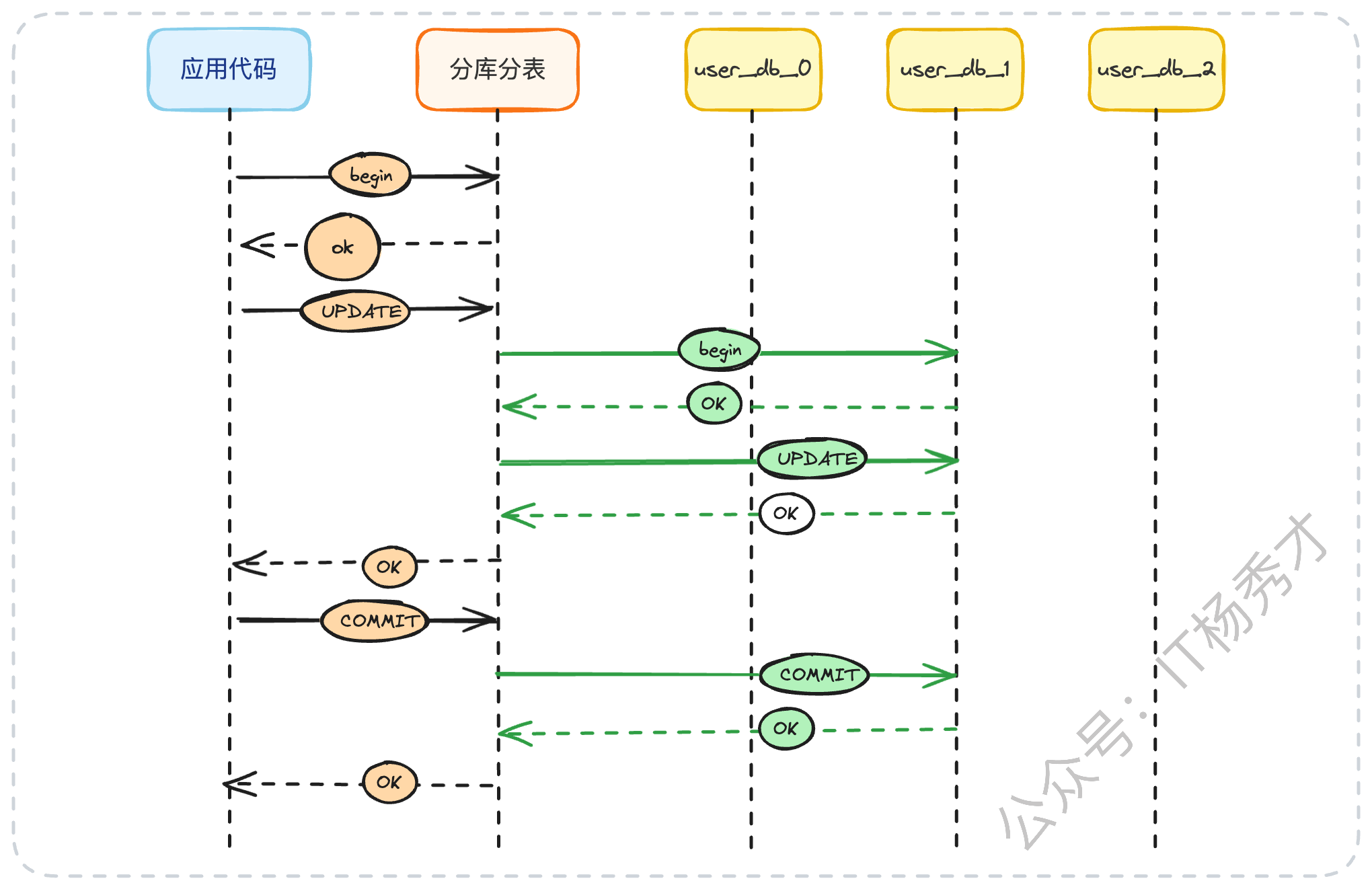 另一种是优化方案,即延迟事务:应用层执行 Begin,中间件什么也不做,只是在内存中标记一下事务已开始。当应用层执行第一条 SQL(比如 UPDATE ... WHERE user_id = 50),中间件解析出它需要路由到 db_0。此时,中间件检查 db_0 上是否已开启事务,发现没有,于是在 db_0 上真正开启一个本地事务,并执行 SQL。接着,应用层又执行第二条 SQL(UPDATE ... WHERE user_id = 51),路由到 db_2。中间件检查 db_2,也在 db_2 上开启一个本地事务,并执行 SQL。如果应用层执行第三条 SQL(UPDATE ... WHERE user_id = 50 ...),路由到 db_0,中间件检查 db_0,发现事务已开启,于是复用该事务执行 SQL。最后,当应用层执行 Commit 时,中间件才将 db_0 和 db_2 上所有“延迟开启”的事务,统一执行 Commit。