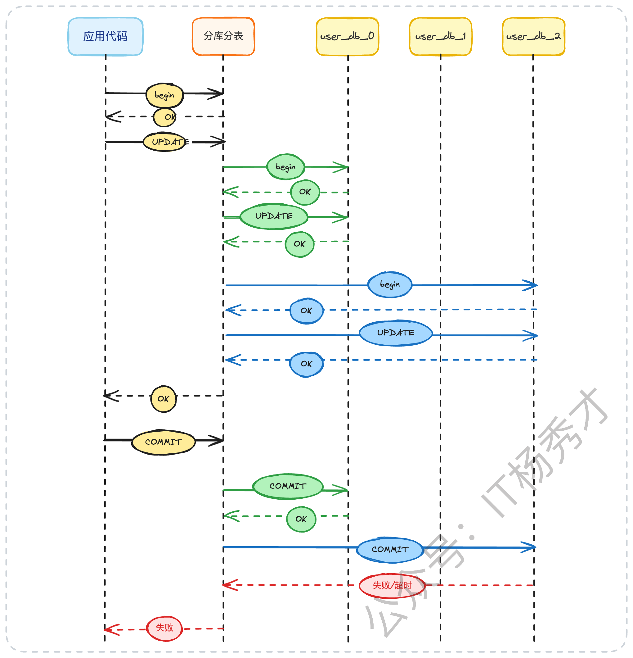 这个“按需开启”的方案是不是非常高效?但是,它依然没有逃过那个根本问题:如果 Commit 的时候,db_0 提交成功了,但 db_2 提交失败(或超时)了,怎么办?
