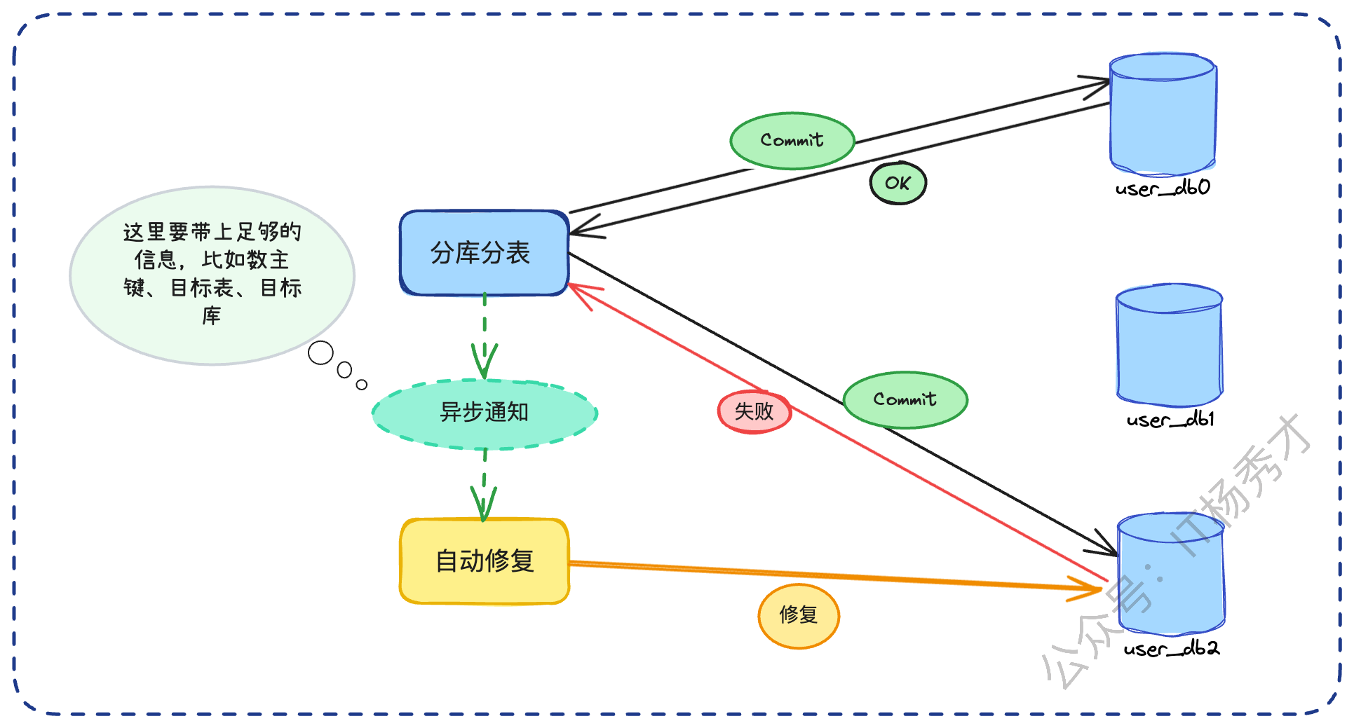 然后,我们有一个独立的自动修复服务来消费这条消息。这个服务会根据业务逻辑,来决定是正向修复(用 db_0 已提交的数据去强行修复 db_2 的数据)还是逆向补偿(把 db_0 的数据给回滚了)。这个修复逻辑通常是和业务强相关的,需要业务方来定义和接入。