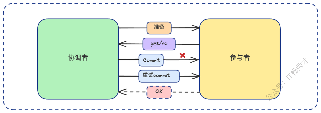 那么,如果故障发生在阶段二呢?这里有两个值得深思的场景。第一个场景:协调者发出了 Commit,但某个参与者没收到。 这种情况下,协调者会不断重试,直到该参与者确认收到 Commit 指令为止。这是为了保证所有节点最终都能达成一致。