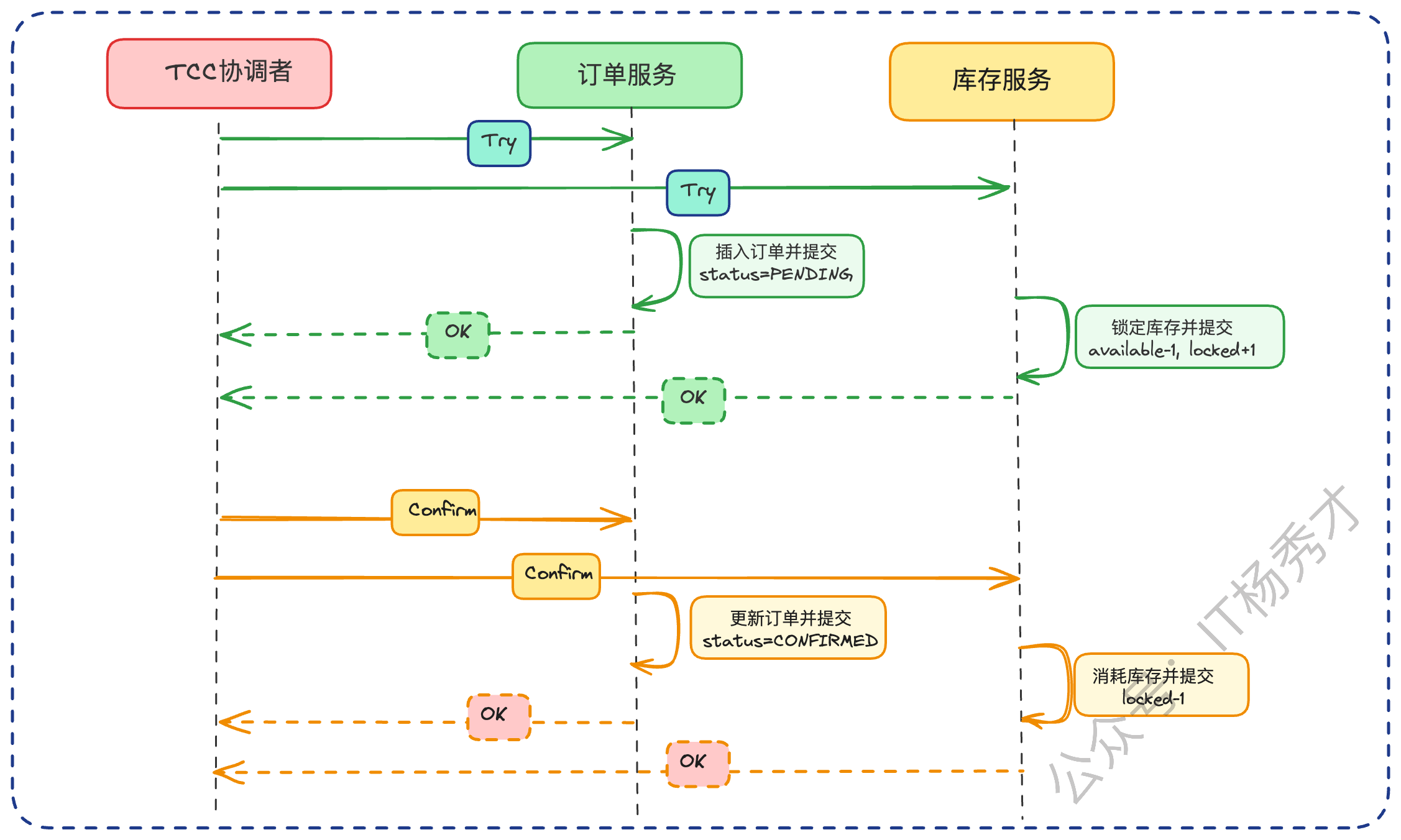 如果所有 Try 均成功,TCC 框架开始调用 Confirm 阶段。