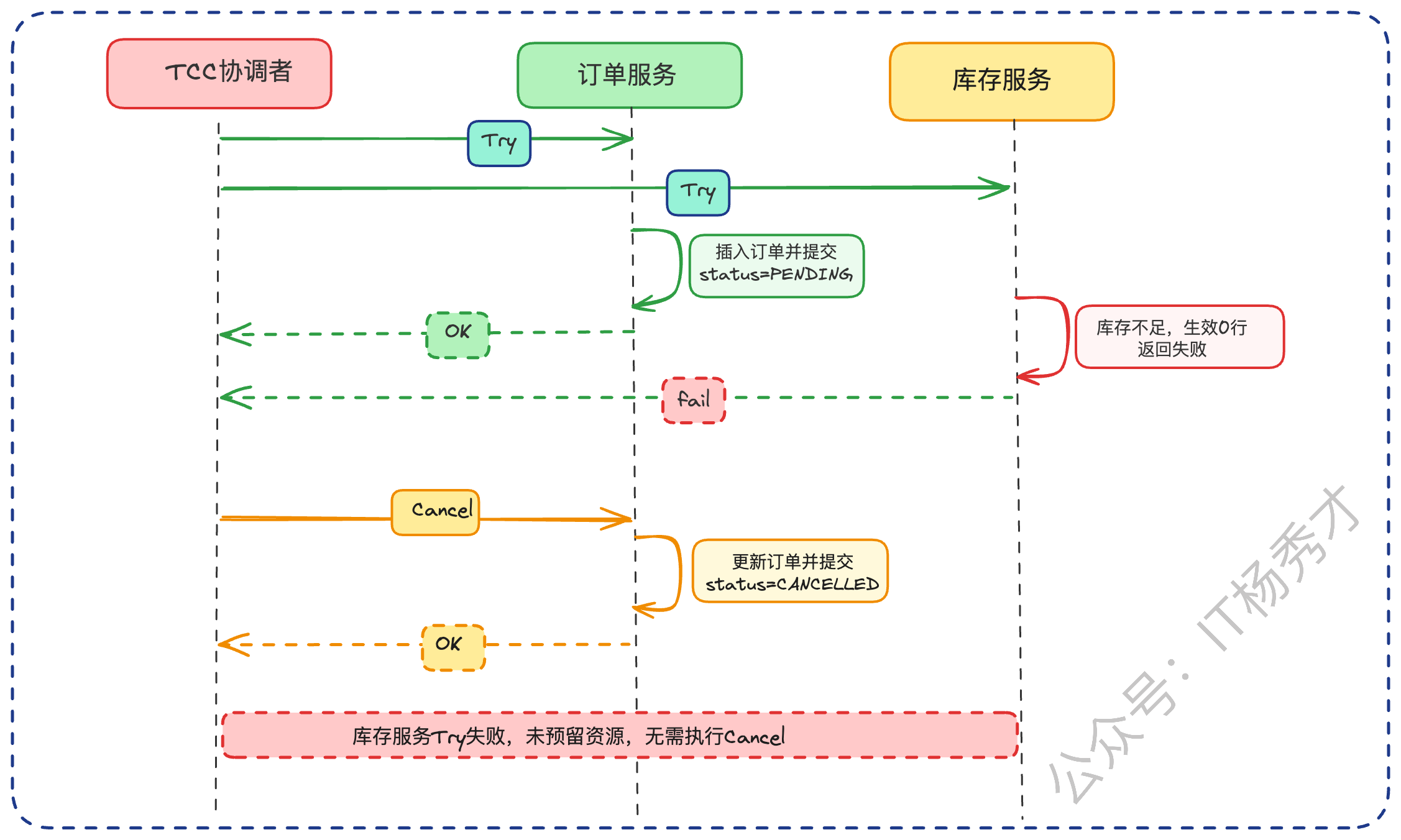 UPDATE orders SET status = 'CANCELLED' WHERE ...库存服务由于之前检查数量不足没有执行数量的扣减,这里无需执行cancel操作。如果之前 Try 已成功。